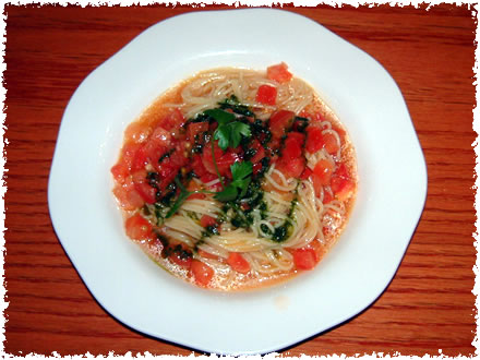 フレッシュトマトの冷製スパゲッティー。酸味が爽やかだ。