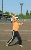 問題はスイングに入る時、この左手をどう使うかですね。ただ漠然と下げるのではなく、積極的に左腕(左肘)を使いましょう。絵の構えから、右腕が動き出す前に左肘を引く事で、肩を入れ替える(肩の高さを左右逆転させる)とともに上体の捻りを先導します。左腕にも意識を持つ事で、とかく力み勝ちな右腕から余計な力が抜け楽にスイング出来るはずです。あと、皆さん共通の課題ですが、絵の構えの際のスタンスが狭い事と、膝が伸びて棒立ちのケースが多いですね。軽く膝を曲げ、スタンスを広くとる事で下半身を安定させると、ロブを見上げるのが楽になりタイミングがつかみ易くなるはずです。