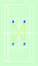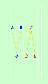 センターラインで二分したサービスエリア内でA・B対C、D・E対Fがラリーを行います。