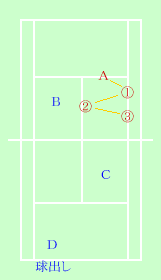1本面の球出しはバックサイド@へ。 2本目はフォアサイドAへ。