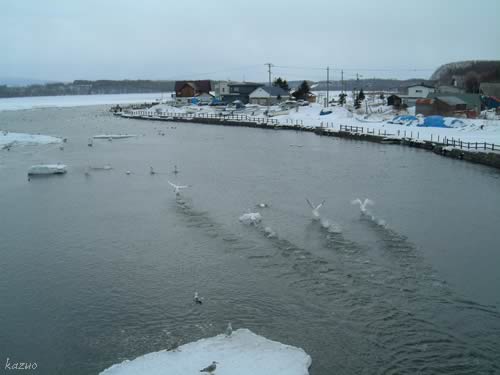 3月5日(水)am9:35予定通り女満別に到着。白い大地に感激。オーロラ号が出港出来ない事を知り、がっかり。港の食堂で塩ラーメンを食べた。味噌も良い味だった。 「知床」へ気持ちを切り替えランサーセディアワゴンのアクセルを踏んだ。244号線は雪もなくやや拍子抜け。そこへ白鳥が飛び込んできた。