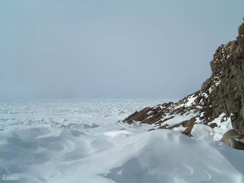 流氷のオホーツクを間近で見た。踏み出したい衝動を抑え、流氷神社に幸運を祈願した。