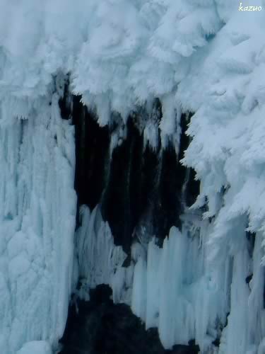 滝の氷は風上に向かってエビの尻尾を出し、樹氷のようだった。