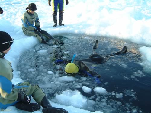 シュノーケルを付け、オホーツクの流氷の下を覗いた。クリオネは見えなかったが神秘的だった。
