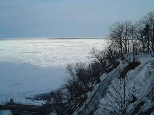 オシンコシンの滝を上から臨む。流氷原には大きな割れ目が出来ていた。