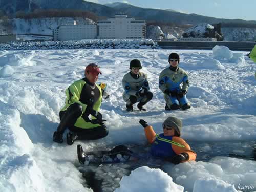 確かに浮いた。でもまだ不安そうに両脇の氷へ手を伸ばす・・・。
